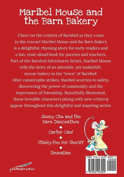 Cheer on the critters of Barnhof as they come to the rescue! Maribel Mouse (and the Barn Bakery) is delightful, rhyming story for early readers and a fun, read-aloud book for parents and teachers. Part of the Barnhof Adventures Series, Maribel Mouse tells the story of an adorable, yet makeshift, mouse bakery in the "town" of Barnhof. After catastrophe strikes, Maribel scurries to safety, discovering the power of community and the importance of friendship. Beautifully illustrated, these loveable characters (along with new critters) appear throughout this delightful and inspiring series.