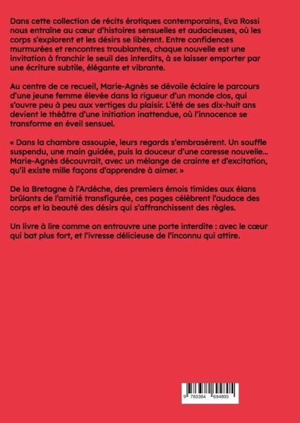 Dans cette collection de récits érotiques contemporains, Eva Rossi nous entraîne au coeur d'histoires sensuelles et audacieuses, où les corps s'explorent et les désirs se libèrent. Entre confidences murmurées et rencontres troublantes, chaque nouvelle est une invitation à franchir le seuil des interdits, à se laisser emporter par une écriture subtile, élégante et vibrante.Au centre de ce recueil, Marie-Agnès se dévoile éclaire le parcours d'une jeune femme élevée dans la rigueur d'un monde clos, qui s'ouvre peu à peu aux vertiges du plaisir. L'été de ses dix-huit ans devient le théâtre d'une initiation inattendue, où l'innocence se transforme en éveil sensuel.« Dans la chambre assoupie, leurs regards s'embrasèrent. Un souffle suspendu, une main guidée, puis la douceur d'une caresse nouvelle... Marie-Agnès découvrait, avec un mélange de crainte et d'excitation, qu'il existe mille façons d'apprendre à aimer. »De la Bretagne à l'Ardèche, des premiers émois timides aux élans brûlantsde l'amitié transfigurée, ces pages célèbrent l'audace des corps et la beauté des désirs qui s'affranchissent des règles.Un livre à lire comme on entrouvre une porte interdite : avec le coeur qui bat plus fort, et l'ivresse délicieuse de l'inconnu qui attire.