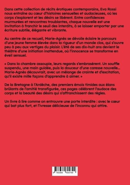 Dans cette collection de récits érotiques contemporains, Eva Rossi nous entraîne au coeur d'histoires sensuelles et audacieuses, où les corps s'explorent et les désirs se libèrent. Entre confidences murmurées et rencontres troublantes, chaque nouvelle est une invitation à franchir le seuil des interdits, à se laisser emporter par une écriture subtile, élégante et vibrante.Au centre de ce recueil, Marie-Agnès se dévoile éclaire le parcours d'une jeune femme élevée dans la rigueur d'un monde clos, qui s'ouvre peu à peu aux vertiges du plaisir. L'été de ses dix-huit ans devient le théâtre d'une initiation inattendue, où l'innocence se transforme en éveil sensuel.« Dans la chambre assoupie, leurs regards s'embrasèrent. Un souffle suspendu, une main guidée, puis la douceur d'une caresse nouvelle... Marie-Agnès découvrait, avec un mélange de crainte et d'excitation, qu'il existe mille façons d'apprendre à aimer. »De la Bretagne à l'Ardèche, des premiers émois timides aux élans brûlantsde l'amitié transfigurée, ces pages célèbrent l'audace des corps et la beauté des désirs qui s'affranchissent des règles.Un livre à lire comme on entrouvre une porte interdite : avec le coeur qui bat plus fort, et l'ivresse délicieuse de l'inconnu qui attire.