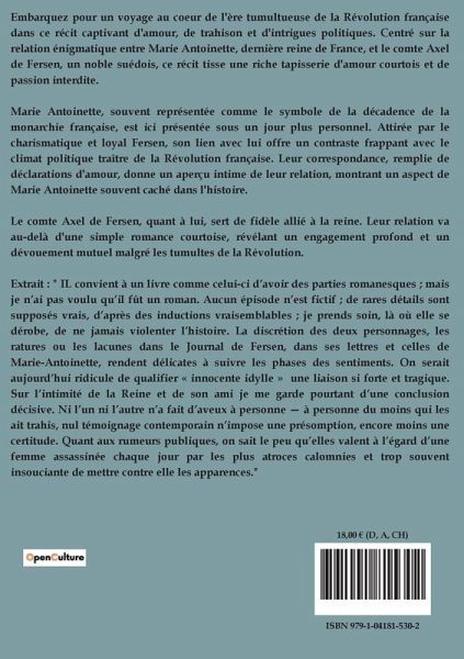 Embarquez pour un voyage au coeur de l'ère tumultueuse de la Révolution française dans ce récit captivant d'amour, de trahison et d'intrigues politiques. Centré sur la relation énigmatique entre Marie Antoinette, dernière reine de France, et le comte Axel de Fersen, un noble suédois, ce récit tisse une riche tapisserie d'amour courtois et de passion interdite. Marie Antoinette, souvent représentée comme le symbole de la décadence de la monarchie française, est ici présentée sous un jour plus personnel. Attirée par le charismatique et loyal Fersen, son lien avec lui offre un contraste frappant avec le climat politique traître de la Révolution française. Leur correspondance, remplie de déclarations d'amour, donne un aperçu intime de leur relation, montrant un aspect de Marie Antoinette souvent caché dans l'histoire. Le comte Axel de Fersen, quant à lui, sert de fidèle allié à la reine. Leur relation va au-delà d'une simple romance courtoise, révélant un engagement profond et un dévouement mutuel malgré les tumultes de la Révolution. Extrait : " IL convient à un livre comme celui-ci d¿avoir des parties romanesques ; mais je n¿ai pas voulu qüil fût un roman. Aucun épisode n¿est fictif ; de rares détails sont supposés vrais, d¿après des inductions vraisemblables ; je prends soin, là où elle se dérobe, de ne jamais violenter l¿histoire. La discrétion des deux personnages, les ratures ou les lacunes dans le Journal de Fersen, dans ses lettres et celles de Marie-Antoinette, rendent délicates à suivre les phases des sentiments. On serait aujourd¿hui ridicule de qualifier « innocente idylle » une liaison si forte et tragique. Sur l¿intimité de la Reine et de son ami je me garde pourtant d¿une conclusion décisive. Ni l¿un ni l¿autre n¿a fait d¿aveux à personne ¿ à personne du moins qui les ait trahis, nul témoignage contemporain n¿impose une présomption, encore moins une certitude. Quant aux rumeurs publiques, on sait le peu qüelles valent à l¿égard d¿une femme assassinée chaque jour par les plus atroces calomnies et trop souvent insouciante de mettre contre elle les apparences."