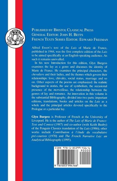This is a title in the Bristol Classical Press French Texts series, in French with English notes, vocabulary and introduction. Marie de France occupies a unique place in the history of literature as one of the earliest female writers of medieval Europe. In the second half of the 12th century she composed 12 poems, known as the "Lais", which offer a blend of romance and realism. Through these poems it is possible to gain an understanding of feudal society and glimpse the problems which beset both male and female members of the aristocracy at that time. The collection was first edited in 1954 by Alfred Ewert. Professor Glyn Burgess has re-written the introduction and provided an update of the bibliography, which lists all the substantiated literary studies devoted to these poems.