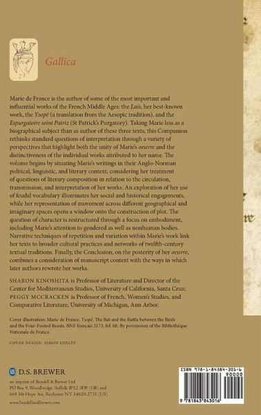 Marie de France is the author of some of the most influential and important works to survive from the middle ages; arguably best-known for her 'Lais', she also translated Aesop's Fables (the 'Ysopë'), and wrote the 'Espurgatoire seint Patriz' (St Patrick's Purgatory), based on a Latin text. The aim of this Companion is both to provide information on what can be gleaned of her life, and on her poetry, and to rethink standard questions of interpretation, through topics with special relevance to medieval literature and culture. The variety of perspectives used highlights both the unity of Marie's 'oeuvre' and the distinctiveness of the individual texts. After situating her writings in their Anglo-Norman political, linguistic, and literary context, this volume considers her treatment of questions of literary composition in relation to the circulation, transmission, and interpretation of her works. Her social and historical engagements are illuminated by the prominence of feudal vocabulary, while her representation of movement across different geographical and imaginary spaces opens a window on plot construction. Repetition and variation are considered as a narrative technique within Marie's work, and as a cultural practice linking her texts to a network of twelfth-century textual traditions. The Conclusion, on the posterity of her 'oeuvre', combines a consideration of manuscript context with the ways in which later authors rewrote Marie's works. Sharon Kinoshita is Professor of Literature, University of California, Santa Cruz; Peggy McCracken is Professor of French, Women's Studies, and Comparative Literature, University of Michigan, Ann Arbor.