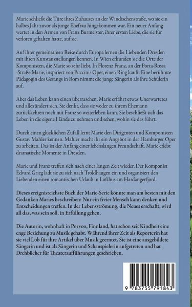 Marie schliess in Weimar die Türe ihres Zuhauses, wo sie ein halbes Jahr zuvor als junge Ehefrau hingekommen war. Ein neuer Anfang wartet in den Armen von Franz, ihrer ersten Liebe, die sie für verloren gehalten hatte, auf sie. Aber das Leben kann einen überraschen. Marie erfährt in Rom etwas Unerwartetes und alles ändert sich. Sie beschliesst das Leben in die eigene Hände zu nehmen und sehen, wohin sie das führt. Durch einen glücklichen Zufall lernt Marie den Dirigenten und Komponisten Gustav Mahler kennen. Mahler macht ihr ein Angebot in der Hamburger Oper zu arbeiten. Das ist der Anfang einer lebenslangen Freundschaft. Marie erlebt dramatische Momente in Dresden. Marie und Franz treffen sich nach einer langen Zeit wieder. Der Komponist Edvard Grieg lädt sie zu sich nach Trldhaugen und organisiert einen romantischen Urlaub in Lofthus am Hardangenfjord..