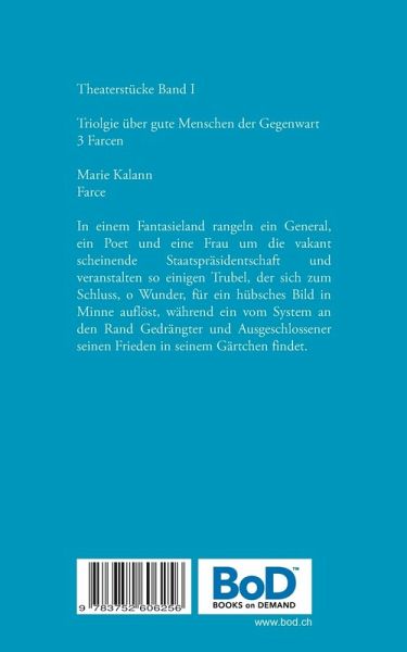 Theaterstücke Band ITrilogie über gute Menschen der Gegenwart3 FarcenMarie KalannFarceIn einem Fantasieland rangeln ein General, ein Poet und eine Frau um die vakant scheinende Staatspräsidentschaft und veranstalten so einigen Trubel, der sich zum Schluss, o Wunder, für ein hübsches Bild in Minne auflöst, während ein vom System an den Rand Gedrängter und Ausgeschlossener seinen Frieden in seinem Gärtchen findet.