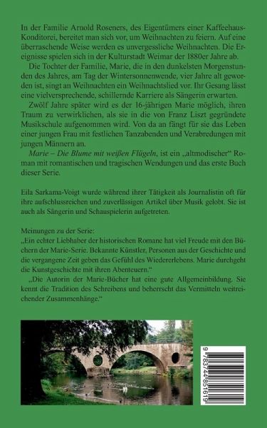 In der Familie Arnold Roseners, des Eigentümers einer Kaffeehaus-Konditorei, bereitet man sich vor, um Weihnachten zu feiern. Auf eine überraschende Weise werden es unvergessliche Weihnachten.Die Ereignisse spielen sich in der Kulturstadt Weimar der 1880 ab. Die Tochter der Familie, Marie, am Tag der Wintersonnenwende, vier Jahre alt geworden ist, singt ein Weihnachtslied vor. Ihr Gesang lässt eine vielversprechende, schillernde Karriere als Sängerin erwarten. Zwölf Jahre später wird es der 16-jährigen Marie möglich, ihren Traum zu verwirklichen, als sie in den von Franz Liszt gegründete Musikschule aufgenommen wird. Von da an fängt für sie das Leben einer jungen Frau mit festlichen Tanzabenden und Verabredungen mit jungen Männern an. Marie - Die Blume mit weißen Flügeln, ist ein altmodischer Roman mit romantischen und tragischen Wendungen und das erste Buch dieser Serie.