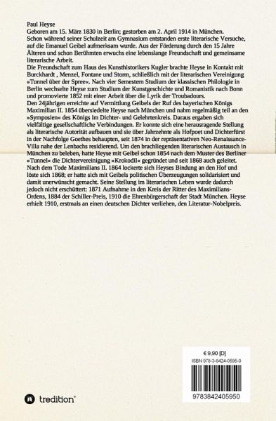 Paul Heyse (1830-1919), der Inbegriff des deutschsprachigen Dichters, war seit seinem 24. Lebensjahr Poeta laureatus am Hof Maximilians II. Mit seinen Novellen erlangte er in den siebziger Jahren des 19. Jahrhunderts große Berühmtheit. Sie wurden insbesondere für ihre 'vornehme Einfachheit', die sie unverkennbar machen, geschätzt. Später geriet er - und mit ihm sein Werk - ins Kreuzfeuer der Kritik. Von den Naturalisten wurde er wegen seiner bislang unangefochtenen Stellung als Vorzeigedichter angefeindet, andere verurteilten seine Novellen als zu unmoralisch. 1910 erhielt Paul Heyse für sein dichterisches Werk den Nobelpreis für Literatur.