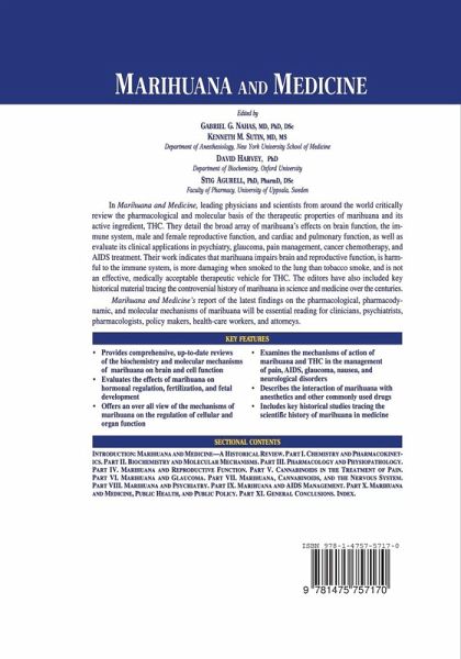 "This is a comprehensive new book covering the pharmacological, metabolic, and therapeutic properties of marijuana. Written and edited by researchers in the field, this is a valuable contribution to the field. . .Topics covered include an historical review, chemistry and pharmacokinetics, biochemistry and molecular mechanisms, pharmacology and physiopathology, reproductive function, treatment of pain, glaucoma, effects on the nervous system, marijuana and psychiatry, AIDS management, marijuana and medicine, public health, and public policy. . .This is a valuable book with a focus on the molecular and clinical aspects