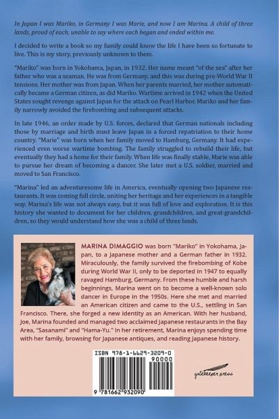 In Japan I was Mariko, in Germany I was Marie, and now I am Marina. A child of three lands, proud of each, unable to say where each began and ended within me. I decided to write a book so my family could know the life I have been so fortunate to live. This is my story, previously unknown to them. "Mariko" was born in Yokohama, Japan, in 1932. Her name meant "of the sea" after her father who was a seaman. He was from Germany, and this was during pre-World War II tensions. Her mother was from Japan. When her parents married, her mother automatically became a German citizen, as did Mariko. Wartime arrived in 1942 when the United States sought revenge against Japan for the attack on Pearl Harbor. Mariko and her family narrowly avoided the firebombing and subsequent attacks. In late 1946, an order made by U.S. forces, declared that German nationals including those by marriage and birth must leave Japan in a forced repatriation to their home country. "Marie" was born when her family moved to Hamburg, Germany. It had experienced even worse wartime bombing. The family struggled to rebuild their life, but eventually they had a home for their family. When life was finally stable, Marie was able to pursue her dream of becoming a dancer. She later met a U.S. soldier, married and moved to San Francisco. "Marina" led an adventuresome life in America, eventually opening two Japanese restaurants. It was coming full circle, uniting her heritage and her experiences in a tangible way. Marina's life was not always easy, but it was full of love and exploration. It is this history she wanted to document for her children, grandchildren and great-grandchildren, so they would understand how she was a child of three lands.
