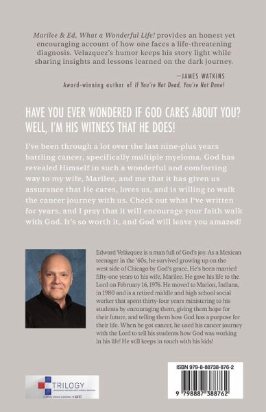 Marilee & Ed, What a Wonderful Life! provides an honest yet encouraging account of how one faces a life-threatening diagnosis. Velazquez's humor keeps his story light while sharing insights and lessons learned on the dark journey. -JAMES WATKINS Award-winning author of If You're Not Dead, You're Not Done! HAVE YOU EVER WONDERED IF GOD CARES ABOUT YOU? WELL, I'M HIS WITNESS THAT HE DOES! I've been through a lot over the last nine-plus years battling cancer, specifically multiple myeloma. God has revealed Himself in such a wonderful and comforting way to my wife, Marilee, and me that it has given us assurance that He cares, loves us, and is willing to walk the cancer journey with us. Check out what I've written for years, and I pray that it will encourage your faith walk with God. It's so worth it, and God will leave you amazed!