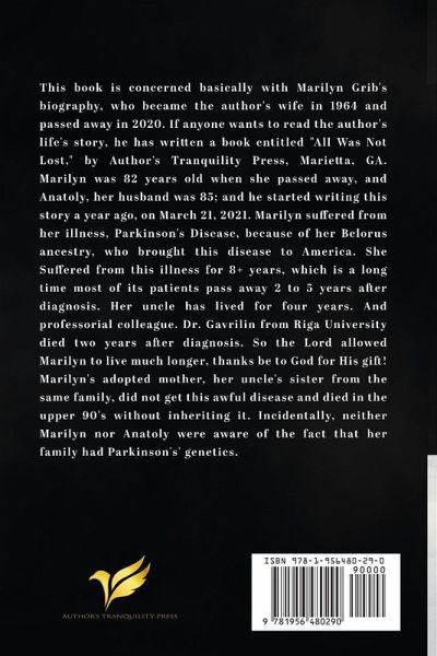 This book is concerned basically with Marilyn Grib's biography, who became the author's wife in 1964 and passed away in 2020. If anyone wants to read the author's life's story, he has written a book entitled "All Was Not Lost," by Tranquility Press, Marietta, GA. Marilyn was 82 years old when she passed away, and Anatoly, her husband was 85; and he started writing this story a year ago, on March 21, 2021. Marilyn suffered from her illness, Parkinson's Disease, because of her Belorus ancestry, who brought this disease to America. She Suffered from this illness for 8+ years, which is a long time most of its patients pass away 2 to 5 years after diagnosis. Her uncle has lived for four years. And professorial colleague. Dr. Gavrilin from Riga University died two years after diagnosis. So the Lord allowed Marilyn to live much longer, thanks be to God for His gift! Marilyn's adopted mother, her uncle's sister from the same family, did not get this awful disease and died in the upper 90's without inheriting it. Incidentally, neither Marilyn nor Anatoly were aware of the fact that her family had Parkinson's' genetics.