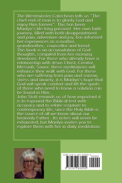 The Westminster Catechism tells us "The chief end of man is to glorify God and enjoy Him forever". This has been Marilyn's life-long passion! Her own faith journey, filled with both disappointment and pain, adventure and joy, has informed her experiences as a mother, grandmother, counselor and friend. As a counselor she has listened to many stories of fear and helplessness, even hopelessness and despair; as a Bible teacher, she has thrilled to see the truths of scripture come alive in hearts that surrendered those feelings to God! This book is an accumulation of God-thoughts, compiled from her morning devotions. For those who already have a relationship with Jesus Christ, Creator, Messiah, Savior, these meditations will enhance their walk with God. For those who are suffering from pain and sorrow, stress and anxiety, it is Marilyn's hope that God will speak comfort and lift the spirits of those who need to know a solution can be found in Him.