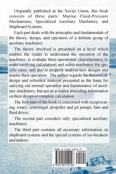 Originally published in the Soviet Union, this book consists of three parts: Marine Fluid-Pressure Mechanisms, Specialized Auxiliary Machinery, and Shipboard Systems. Each part deals with the principles and fundamentals of the theory, design, and operation of a definite group of auxiliary machinery. The theory involved is presented on a level which enables the reader to understand the operation of the machines, to evaluate their operational characteristics, to make verifying calculations and select machinery for specific cases, and also to properly analyze new designs and master their operation. The author regards the theoretical, design and reference material presented as the basis for carrying out normal operation and maintenance of auxiliary machinery, but not as a source providing information on their design or complete calculation. The first part of the book is concerned with reciprocating, rotary, centrifugal, propeller and jet pumps, fans and fluid drives. The second part considers only specialized auxiliary machinery. The third part contains all necessary information on shipboard systems and the special systems of ice-breakers and tankers.