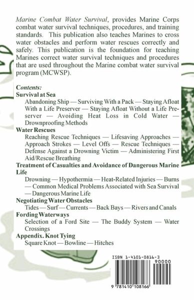 Marine Combat Water Survival, provides Marine Corps combat water survival techniques, procedures, and training standards. This publication also teaches Marines to cross water obstacles and perform water rescues correctly and safely. This publication is the foundation for teaching Marines correct water survival techniques and procedures that are used throughout the Marine combat water survival program (MCWSP). CONTENTS Chapter 1. Survival at Sea Abandoning Ship Jettisoning Equipment Abandoning Ship Technique Modified Abandoning Ship Technique Surface Burning Oil Swim Surviving With a Pack Preparing Equipment Tying Waterproof/Plastic Bags Packing the Pack Swimming With the Pack Staying Afloat With a Life Preserver Inherently Buoyant Life Preservers Inflatable Life Preservers Staying Afloat Without a Life Preserver Floating With an Inflated Blouse Floating With Inflated Trousers Sling Method Splash Method Blow Method Avoiding Heat Loss in Cold Water Individual Protection From the Cold Group Protection From the Cold Drownproofing Methods Crawl Stroke T-Method The Sweep Breast Stroke Side Stroke Elementary Backstroke Chapter 2. Water Rescues Reaching Rescue Techniques Reach Reach From a Deck Arm Extension Leg Extension Wading Assist Throw Lifesaving Approaches Front Surface Approach Rear Approach Approach Strokes Crawl Stroke Approach Stroke Breast Stroke Approach Stroke Level Offs Front Surface Approach Single Armpit Level Off Double Armpit Level Off Rescue Techniques Wrist Tow Single Armpit Tow Double Armpit Tow Collar Tow Cross-Chest Carry Tired Swimmer's Assist Defense Against a Drowning Victim Block Wrist-Grip Escape/Wrist-Grip Escape Alternative Front Head-Hold Escape Rear Head-Hold Escape Administering First Aid/Rescue Breathing Chapter 3. Treatment of Casualties and Avoidance of Dangerous Marine Life Drowning Symptoms Treatment Hypothermia Symptoms Survival Time Treatment Heat-Related Injuries Burns Common Medical Problems Associated with Sea Survival Seasickness Saltwater Sores Blindness/Headache Constipation Sunburn and Dehydration Dangerous Marine Life Sharks and Barracudas Sea Snakes Poisonous Fish Turtles and Moray Eels Corals Jellyfish, Portuguese Man-of-War, Anemones, and Others Spiny Fish, Urchins, Stingrays, and Cone Shells Chapter 4. Negotiating Water Obstacles Tides Surf Plunging Waves Spilling Waves Surging Waves Currents Offshore Currents Rip Currents Littoral Currents Back Bays Rivers and Canals Chapter 5. Fording Waterways Selection of a Ford Site Determine the Slope Clinometer Map Line of Sight and Pace Determine the Current Speed Measure River Width Calculate Downstream Drift The Buddy System Water Crossings Care of Weapons ISOMAT Raft Poncho Raft Construction of a Pack Raft Single-Rope Bridge High and Dry Crossings Swift Current Crossings Slow Current Crossings Removal Appendix. Knot Tying Square Knot Bowline Hitches Half Hitch Two Half Hitches Round Turn and Two Half Hitches Butterfly Knot
