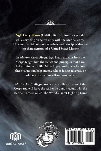 Sgt. Gary Haun (USMC, Retired) lost his eyesight while servicing on active duty with the Marine Corps. However he did not lose the values and principles that are the characteristics of a United States Marine. In Marine Corps Magic, Sgt. Haun explains how the Corps taught him the values and principles that have helped him in his life. More importantly, he tells how these values can help anyone who is facing adversity or who is interested in self-improvement. Marine Corps Magic covers many different areas of the Corps and will leave the reader no doubts about why the Marine Corps is called The World's Finest Fighting Force.