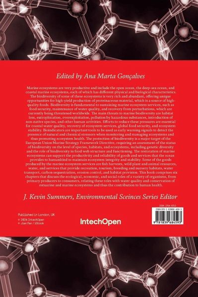 Marine ecosystems are very productive and include the open ocean, the deep-sea ocean, and coastal marine ecosystems, each of which has different physical and biological characteristics. The biodiversity of some of these ecosystems is very rich and abundant, offering unique opportunities for high-yield production of proteinaceous material, which is a source of high-quality foods. Biodiversity is fundamental to sustaining marine ecosystem services, such as food security, maintenance of water quality, and recovery from perturbations, which are currently being threatened worldwide. The main threats to marine biodiversity are habitat loss, eutrophication, overexploitation, pollution by hazardous substances, introduction of non-native species, and other human activities. Efforts to reduce these pressures are essential for coastal water quality, recovery of ecosystem services, global food security, and ecosystem stability. Bioindicators are important tools to be used as early warning signals to detect the presence of natural and chemical stressors when monitoring and managing ecosystems and thus promoting ecosystem health. The protection of biodiversity is a major target of the European Union Marine Strategy Framework Directive, requiring an assessment of the status of biodiversity on the level of species, habitats, and ecosystems, including genetic diversity and the role of biodiversity in food web structure and functioning. The restoration of marine ecosystems can support the productivity and reliability of goods and services that the ocean provides to humankind to maintain ecosystem integrity and stability. Some of the goods produced by the marine ecosystem services are fish harvests, wild plant and animal resources, water, and services that provide recreation, tourism, breeding and nursery habitats, water transport, carbon sequestration, erosion control, and habitat provision. This book comprises six chapters that discuss the ecological, economic, and social roles of a variety of organisms, from primary producers to consumers, relating these roles with water quality and conservation of estuarine and marine ecosystems and thus the contribution to human health.