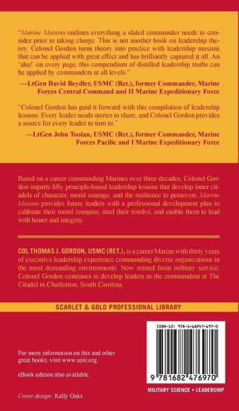 Marine Maxims is a collection of fifty principle-based leadership lessons that Thomas J. Gordon acquired commanding Marines over a career spanning three decades of service. Dealing with the complexities and challenges of the contemporary operating environment requires an internal moral compass fixed true. These maxims focus on developing inner citadels of character, moral courage, and the resilience to persevere in a contested domain where information is key. Its purpose is to provide future leaders with a professional development plan that will steel their resolve and enable them to lead with honor. Thematically, these maxims build upon a foundation of character, courage, and will. To be effective, a leader must model and inspire the will to persevere in the face of danger or adversity. The essence of effective leadership is credibility. A leader's credibility is derived from a congruence of competence and character. Exceptional leaders are not remembered for what they accomplished, but how they did it. Those that lead with integrity will be remembered as a leader worth following.