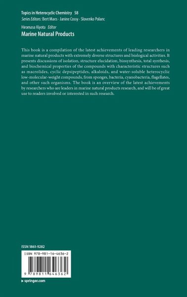 This book is a compilation of the latest achievements of leading researchers in marine natural products with extremely diverse structures and biological activities. It presents discussions of isolation, structure elucidation, biosynthesis, total synthesis, and biochemical properties of the compounds with characteristic structures such as macrolides, cyclic depsipeptides, alkaloids, and water-soluble heterocyclic low-molecular-weight compounds, from sponges, bacteria, cyanobacteria, flagellates, and other such organisms. The book especially focuses on heterocyclic natural products as a title in the book series, Topics in Heterocyclic Chemistry.