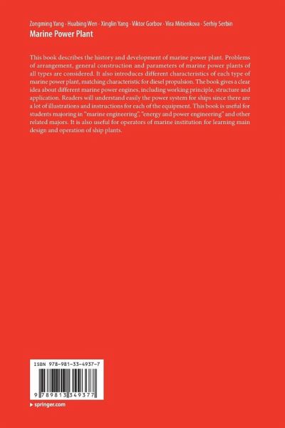 This book describes the history and development of marine power plant. Problems of arrangement, general construction and parameters of marine power plants of all types are considered. It also introduces different characteristics of each type of marine power plant, matching characteristic for diesel propulsion. The book gives a clear idea about different marine power engines, including working principle, structure and application. Readers will understand easily the power system for ships since there are a lot of illustrations and instructions for each of the equipment. This book is useful for students majoring in "marine engineering", "energy and power engineering" and other related majors. It is also useful for operators of marine institution for learning main design and operation of ship plants.