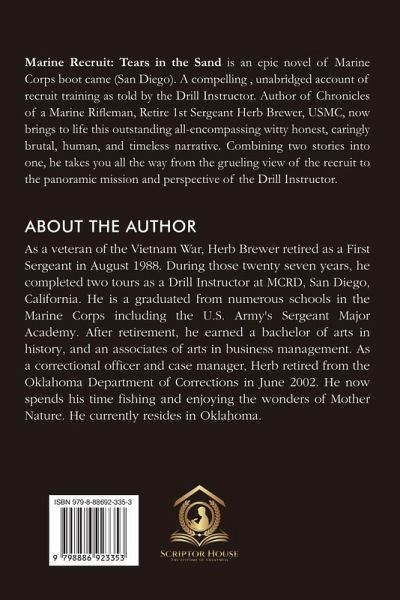 Marine Recruit: Tears in the Sand is an epic novel of Marine Corps boot came (San Diego). A compelling , unabridged account of recruit training as told by the Drill Instructor. Author of Chronicles of a Marine Rifleman, Retire 1st Sergeant Herb Brewer, USMC, now brings to life this outstanding all-encompassing witty honest, caringly brutal, human, and timeless narrative. Combining two stories into one, he takes you all the way from the grueling view of the recruit to the panoramic mission and perspective of the Drill Instructor.