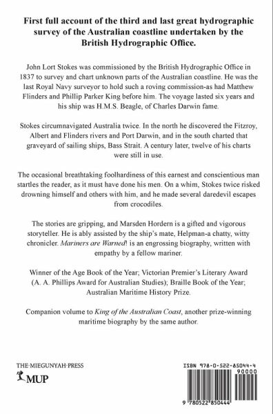John Lort Stokes was commissioned by the British Hydrographic Office in 1837 to survey and chart unknown parts of the Australian coastline. He was the last Royal Navy surveyor to hold such a roving commission-as had Matthew Flinders and Phillip Parker King before him. The voyage lasted six years and his ship was H.M.S. Beagle, of Charles Darwin fame. Stokes circumnavigated Australia twice. In the north he discovered the Fitzroy, Albert and Flinders rivers and Port Darwin, and in the south charted that graveyard of sailing ships, Bass Strait. A century later, twelve of his charts were still in use. The occasional breathtaking foolhardiness of this earnest and conscientious man startles the reader, as it must have done his men. On a whim, Stokes twice risked drowning himself and others with him, and he made several daredevil escapes from crocodiles. The stories are gripping, and Marsden Hordern is a gifted and vigorous storyteller. He is ably assisted by the ship's mate, Helpman-a chatty, witty chronicler. Mariners are Warned! is an engrossing biography, written with empathy by a fellow mariner. Winner of the Age Book of the Year; Victorian Premier's Literary Award (A. A. Phillips Award for Australian Studies); Braille Book of the Year; Australian Maritime History Prize. Companion volume to King of the Australian Coast, another prize-winning maritime biography by the same author.