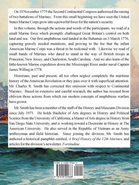 On 10 November 1775 the Second Continental Congress authorized the raising of two battalions of Marines. From this small beginning we have seen the United States Marine Corps grow into a powerful force for the nation's security. In this volume, through the actions and words of the participants, we read of a small Marine force which promptly challenged Great Britain's control on both land and sea. Our first amphibious raid landed in the Bahamas on 3 March 1776, capturing gravely needed munitions, and proving to the foe that the infant American Marine Corps was a threat to be reckoned with. Likewise we read of small bands of Marines who dared to stand in the way of British troops at Princeton, New Jersey, and Charleston, South Carolina. And we also learn of the little-known Marine expedition down the Mississippi River under naval Captain James Willing in 1778. Historians, past and present, all too often neglect completely the maritime history of the American Revolution or they pass over it with superficial attention. Mr. Charles R. Smith has corrected this omission with respect to Continental Marines. Based on extensive and careful research, the author has rescued from oblivion those actions from which our modern concepts of amphibious warfare have grown. Mr. Smith has been a member of the staff of the History and Museums Division since July 1971. He holds Bachelor of Arts degrees in History and Political Science from the University of California, a Master of Arts degree in History from San Diego State University, and is working toward a Doctorate in History at The American University. He also served in the Republic of Vietnam as an Army artilleryman and field historian. Since joining the division, Mr. Smith has authored a historical pamphlet entitled, A Brief History of the 12th Marines, and articles for the division's newsletter, Fortitudine.
