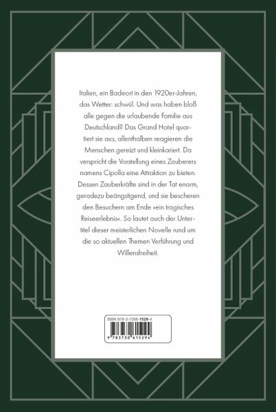 Italien, ein Badeort in den 1920er-Jahren, das Wetter: schwül. Und was haben bloß alle gegen die urlaubende Familie aus Deutschland? Das Grand Hotel quartiert sie aus, allenthalben reagieren die Menschen gereizt und kleinkariert. Da verspricht die Vorstellung eines Zauberers namens Cipolla eine Attraktion zu bieten. Dessen Zauberkräfte sind in der Tat enorm, geradezu beängstigend, und sie bescheren den Besuchern am Ende »ein tragisches Reiseerlebnis«. So lautet auch der Untertitel dieser meisterlichen Novelle rund um die so aktuellen Themen Verführung und Willensfreiheit.