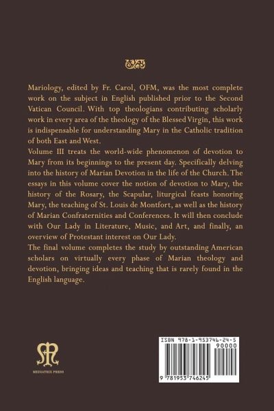Mariology, edited by Fr. Carol, O.F.M., was the most complete work on the subject in English published prior to the Second Vatican Council. With top theologians contributing scholarly work in every area of the theology of the Blessed Virgin, this work is indispensable for understanding Mary in the Catholic tradition of both East and West.Volume III treats the world-wide phenomenon of devotion to Mary from its beginnings to the present day. Specifically delving into the history of Marian Devotion in the life of the Church. The essays in this volume cover the notion of devotion to Mary, the history of the Rosary, the Scapular, liturgical feasts honoring Mary, the teaching of St. Louis de Montfort, as well as the history of Marian Confraternities and Conferences. It will then conclude with Our Lady in Literature, Music, and Art, and finally, an overview of Protestant interest on Our Lady. The final volume completes the study by outstanding American scholars on virtually every phase of Marian theology and devotion, bringing ideas and teaching that is rarely found in the English language.