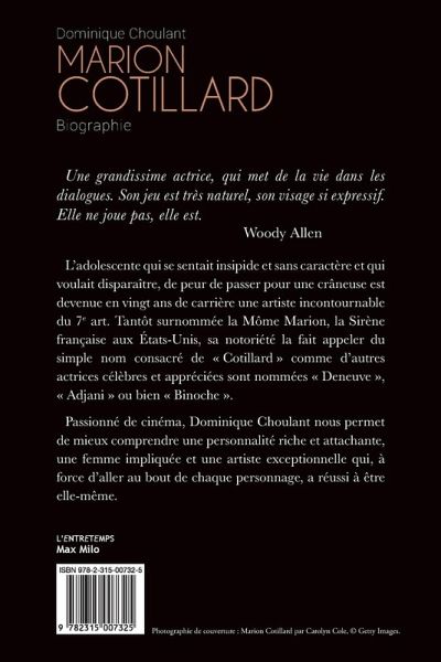 "Une grandissime actrice, qui met de la vie dans les dialogues. Son jeu est très naturel, son visage si expressif. Elle ne joue pas, elle est." Woody Allen L'adolescente qui se sentait insipide et sans caractère et qui voulait disparaître, de peur de passer pour une crâneuse est devenue en vingt ans de carrière une artiste incontournable du 7e art. Tantôt surnommée la Môme Marion, la Sirène française aux États-Unis, sa notoriété la fait appeler du simple nom consacré de ¿Cotillard¿ comme d'autres actrices célèbres et appréciées sont nommées ¿Deneuve¿, ¿Adjani¿ ou bien ¿Binoche¿.Passionné de cinéma, Dominique Choulant nous permet de mieux comprendre une personnalité riche et attachante, une femme impliquée et une artiste exceptionnelle qui, à force d'aller au bout de chaque personnage, a réussi à être elle-même.
