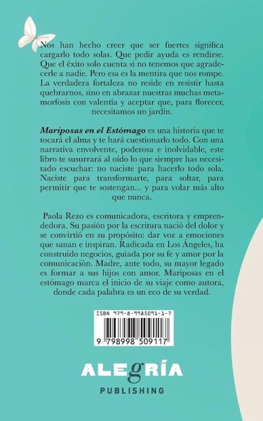 Nos han hecho creer que ser fuertes significa cargarlo todo solas. Que pedir ayuda es rendirse. Que el éxito solo cuenta si no tenemos que agradecerle a nadie. Pero esa es la mentira que nos rompe. La verdadera fortaleza no reside en resistir hasta quebrarnos, sino en abrazar nuestras muchas metamorfosis con valentía y aceptar que, para florecer, necesitamos un jardín. Mariposas en el estómago es una historia que te tocará el alma y te hará cuestionarlo todo. Con una narrativa envolvente, poderosa e inolvidable, este libro te susurrará al oído lo que siempre has necesitado escuchar: no naciste para hacerlo todo sola. Naciste para transformarte, para soltar, para permitir que te sostengan¿ y para volar más alto que nunca. Paola Rezo es comunicadora, escritora y emprendedora. Su pasión por la escritura nació del dolor y se convirtió en su propósito: dar voz a emociones que sanan e inspiran. Radicada en Los Ángeles, ha construido negocios, guiada por su fe y amor por la comunicación. Madre, ante todo, su mayor legado es formar a sus hijos con amor. Mariposas en el estómago marca el inicio de su viaje como autora, donde cada palabra es un eco de su verdad.