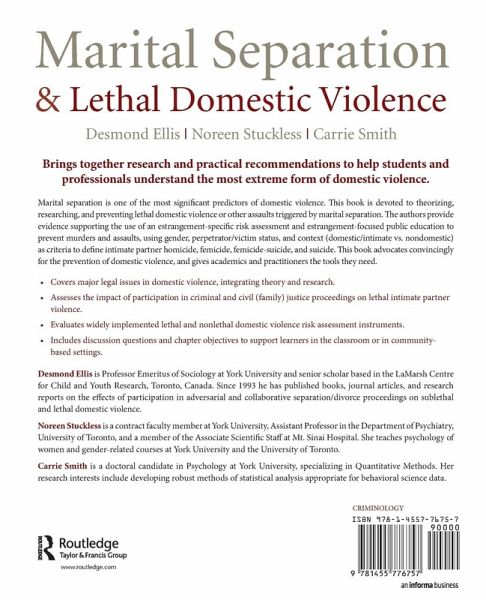 This book is the first to investigate the effects of participation in separation or divorce proceedings on femicide (murder of a female), femicide-suicide, homicide, and suicide. Because separation is one of the most significant predictors of domestic violence, this book is exclusively devoted to theorizing, researching, and preventing lethal domestic violence or other assaults triggered by marital separation. The authors provide evidence supporting the use of an estrangement-specific risk assessment and estrangement-focused public education to prevent murders and assaults. This information is needed not only by instructors in criminal justice and sociology programs, but by researchers theorizing about or investigating domestic violence. In the world of practitioners, family court judges, divorce mediators, family lawyers, prosecutors involved in bail hearings, shelter staff, and family counselors urgently need this resource. Ellis et al. include discussion questions and chapter objectives to support learners in the classroom or in community-based settings, and instructor support material includes PowerPoint lecture slides, additional teaching and research resources, and a test bank. This text advocates convincingly for prevention of domestic violence, and gives academics and practitioners the tools they need. This text advocates convincingly for prevention of domestic violence, and gives academics and practitioners the tools they need.