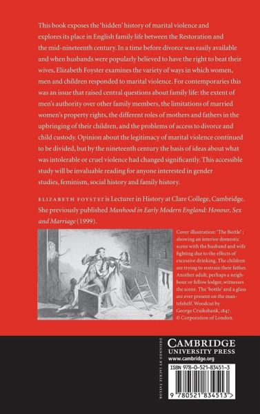 This book exposes the 'hidden' history of marital violence and explores its place in English family life between the Restoration and the mid-nineteenth century. In a time before divorce was easily available and when husbands were popularly believed to have the right to beat their wives, Elizabeth Foyster examines the variety of ways in which men, women and children responded to marital violence. For contemporaries this was an issue that raised central questions about family life: the extent of men's authority over other family members, the limitations of women's property rights, and the problems of access to divorce and child custody. Opinion about the legitimacy of marital violence continued to be divided but by the nineteenth century ideas about what was intolerable or cruel violence had changed significantly. This accessible study will be invaluable reading for anyone interested in gender studies, feminism, social history and family history.