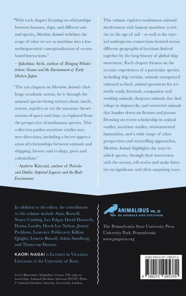 This volume explores nonhuman animals' involvement with human maritime activities in the age of sail-as well as the myriad multispecies connections formed across different geographical locations knitted together by the long history of global ship movement. Far from treating the ship as a confined space defined by the sea, Maritime Animals considers the ship's connections to broader contexts and networks and covers a variety of locations, from the Canadian Arctic to the Pacific Islands. Each chapter focuses on the oceanic experiences of a particular species, from ship vermin, animals transported onboard as food, and animal specimens for scientific study to livestock, companion and working animals, deep-sea animals that find refuge in shipwrecks, and terrestrial animals that hunker down on flotsam and jetsam. Drawing on recent scholarship in animal studies, maritime studies, environmental humanities, and a wide range of other perspectives and storytelling approaches, Maritime Animals challenges an anthropocentric understanding of maritime history. Instead, this volume highlights the ways in which species, through their interaction with the oceans, tell stories and make histories in significant and often surprising ways. In addition to the editor, the contributors to this volume include Anna Boswell, Nancy Cushing, Lea Edgar, David Haworth, Donna Landry, Derek Lee Nelson, Jimmy Packham, Laurence Publicover, Killian Quigley, Lynette Russell, Adam Sundberg, and Thom van Dooren.