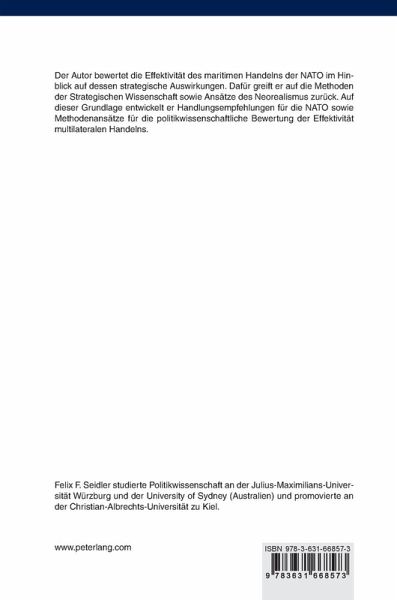 Der Autor bewertet die Effektivität des maritimen Handelns der NATO im Hinblick auf dessen strategische Auswirkungen. Dafür greift er auf die Methoden der Strategischen Wissenschaft sowie Ansätze des Neorealismus zurück. Auf dieser Grundlage entwickelt er Handlungsempfehlungen für die NATO sowie Methodenansätze für die politikwissenschaftliche Bewertung der Effektivität multilateralen Handelns.