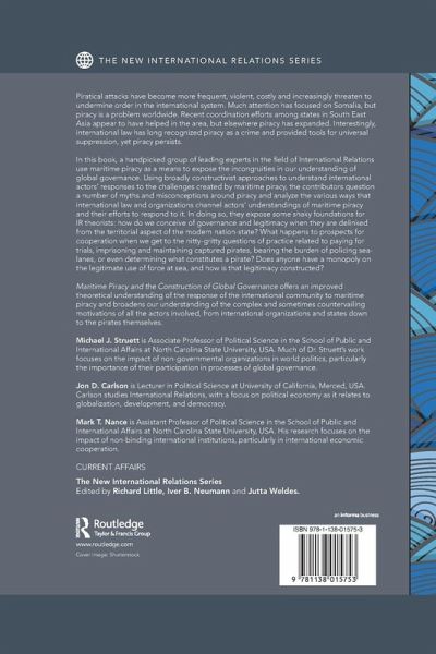 1: Constructing Pirates Piracy and Governance: An Introduction Michael Struett and Mark Nance Section 1: Constructions through Law 2: Cicero's Ghost: Rethinking the Social Construction of Piracy Harry Gould 3: A Global War on Piracy: International Law and the Use of Force Against Sea Pirates Eric Heinze 4: Maritime Piracy and the Impunity Gap: Domestic Implementation of International Treaty Provisions Yvonne Dutton Section 2: Constructions through Institutions 5. Security Communities Alliances and Macrosecuritization: The Practices of Counter-Piracy Governance Christian Bueger and Jan Stockbruegger 6. Conflicting Constructions: Maritime Piracy and Cooperation under Regime Complexes Mark Nance and Michael Struett 7. Frame Humanitarianism and Legitimacy: Explaining the Anti-Piracy Regime in the Gulf of Aden Kevin McGahan and Terence Lee Section 3: Rethinking the Construction of Global Governance for Maritime Piracy 8. The limit(ation)s of International Society? The English School Somali Pirates and the burdens of interpretation Brent Steele 9. Conclusion Bruce Cronin