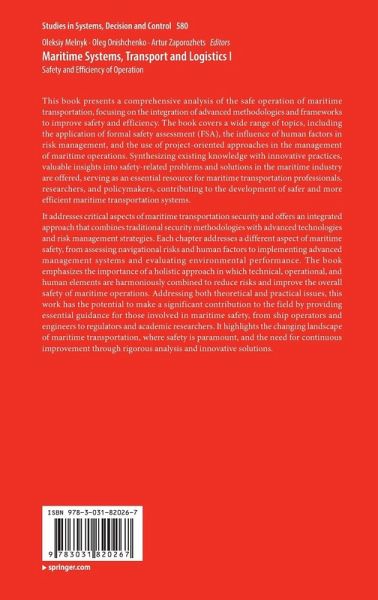 This book presents a comprehensive analysis of the safe operation of maritime transportation, focusing on the integration of advanced methodologies and frameworks to improve safety and efficiency. The book covers a wide range of topics, including the application of formal safety assessment (FSA), the influence of human factors in risk management, and the use of project-oriented approaches in the management of maritime operations. Synthesizing existing knowledge with innovative practices, valuable insights into safety-related problems and solutions in the maritime industry are offered, serving as an essential resource for maritime transportation professionals, researchers, and policymakers, contributing to the development of safer and more efficient maritime transportation systems.