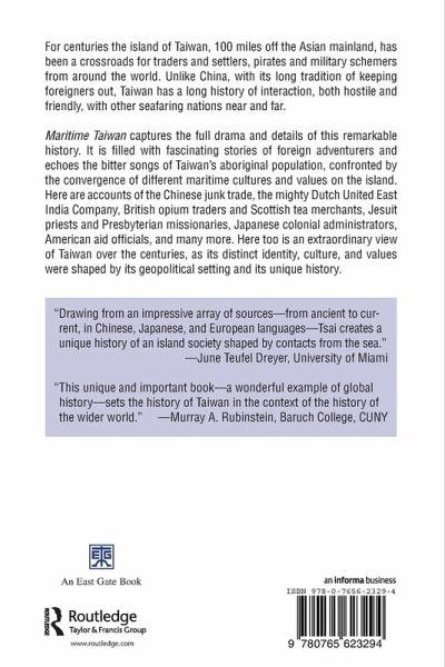 For centuries the island of Taiwan, 100 miles off the Asian mainland, has been a crossroads for traders and settlers, pirates and military schemers from around the world. Unlike China, with its long tradition of keeping foreigners out, Taiwan has a long history of interaction, both hostile and friendly, with other seafaring nations near and far. "Maritime Taiwan" captures the full drama and details of this remarkable history. It's filled with fascinating stories of foreign adventurers and echoes the bitter songs of Taiwan's aboriginal population, confronted by the convergence of different maritime cultures and values on the island.Here are accounts of the legendary pirate Koxinga, the Chinese junk trade, the mighty Dutch East India Company, British opium traders and Scottish tea merchants, Jesuit priests and Presbyterian missionaries, A French fleet commander, a Japanese colonial administrator, an American aid official, and many more. Here too is an extraordinary view of Taiwan over the centuries, as its distinct identity, culture, and values were shaped by its unique history. Today, with a population of only 23 million, Taiwan is the world's nineteenth largest economy, a vibrant, relatively free society on the strategic route between China and Southeast Asia. Maritime Taiwan also discusses the significant impact of American military, economic, educational, and technological aid on Taiwan's developments and addresses the island's continued importance in maintaining the U.S. hegemony in East Asia.