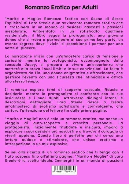 "Marito e Moglie: Romanzo Erotico con Scene di Sesso Esplicito" di Lara Steele è un avvincente romanzo erotico che ti trascinerà in un mondo di desideri nascosti e passioni inesplorate. Ambientato in un sofisticato quartiere residenziale, il libro segue la protagonista, una giovane donna che si trova a partecipare al suo primo key party, un evento segreto dove i vicini si scambiano i partner per una notte di piacere.La narrazione inizia con un'atmosfera carica di tensione e curiosità, mentre la protagonista, accompagnata dalla sensuale Jacey, si prepara a vivere un'esperienza che metterà alla prova i suoi limiti e le sue convinzioni. La festa è organizzata da Tia, una donna enigmatica e affascinante, che gestisce l'evento con una sicurezza che intimidisce e attrae allo stesso tempo.Il romanzo esplora temi di scoperta sessuale, fiducia e desiderio, mentre la protagonista si confronta con le sue insicurezze e i suoi dubbi. Attraverso dialoghi intensi e descrizioni dettagliate, LaraSteele riesce a creare un'atmosfera di erotismo sofisticato e coinvolgente, che cattura l'attenzione del lettore fin dalle prime pagine."Marito e Moglie" non è solo un romanzo erotico, ma anche un viaggio di auto-scoperta e crescita personale. La protagonista, inizialmente titubante e insicura, impara a esplorare i suoi desideri più nascosti e a trovare il coraggio di viverli appieno. Questo libro è perfetto per chi cerca una lettura audace e stimolante, che unisce erotismo e introspezione in un mix esplosivo.Se sei alla ricerca di un romanzo erotico che ti tenga con il fiato sospeso fino all'ultima pagina, "Marito e Moglie" di Lara Steele è la scelta ideale. Immergiti in un mondo di passioni proibite e scopri cosa succede quando i confini tra desiderio e realtà si fanno sempre più sottili.