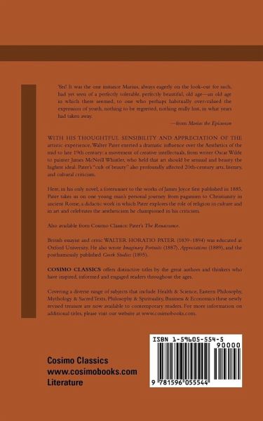 Yes! It was the one instance Marius, always eagerly on the look-out for such, had yet seen of a perfectly tolerable, perfectly beautiful, old age-an old age in which there seemed, to one who perhaps habitually over-valued the expression of youth, nothing to be regretted, nothing really lost, in what years had taken away. -from Marius the Epicurean With his thoughtful sensibility and appreciation of the artistic experience, Walter Pater exerted a dramatic influence over the Aesthetics of the mid to late 19th century: a movement of creative intellectuals, from writer Oscar Wilde to painter James McNeill Whistler, who held that art should be sensual and beauty the highest ideal. Pater's "cult of beauty" also profoundly affected 20th-century arts, literary, and cultural criticism. Here, in his only novel, a forerunner to the works of James Joyce first published in 1885, Pater takes us on one young man's personal journey from paganism to Christianity in ancient Rome, a didactic work in which Pater explores the role of religion in culture and in art and celebrates the aestheticism he championed in his criticism. Also available from Cosimo Classics: Pater's The Renaissance. British essayist and critic WALTER HORATIO PATER (1839-1894) was educated at Oxford University. He also wrote Imaginary Portraits (1887), Appreciations (1889), and the posthumously published Greek Studies (1895).