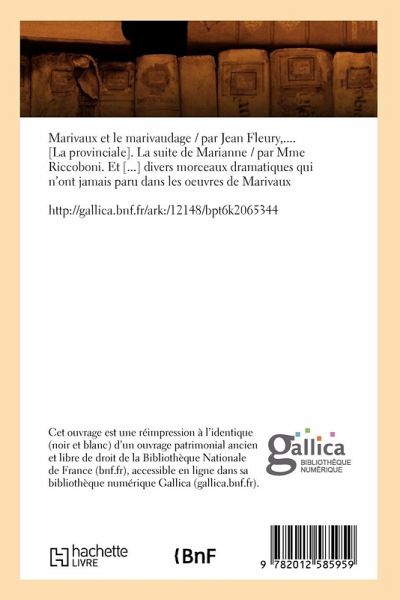 Marivaux et le marivaudage / par Jean Fleury, .... [La provinciale]. La suite de Marianne / par Mme Riccoboni. Et [...] divers morceaux dramatiques qui n'ont jamais paru dans les oeuvres de Marivaux Date de l'édition originale: 1881 Sujet de l'ouvrage: Marivaux, Pierre de (1688-1763)Théâtre français -- 18e siècle Comprend: La provinciale; La suite de Marianne; [Extraits divers] Le présent ouvrage s'inscrit dans une politique de conservation patrimoniale des ouvrages de la littérature Française mise en place avec la BNF. HACHETTE LIVRE et la BNF proposent ainsi un catalogue de titres indisponibles, la BNF ayant numérisé ces oeuvres et HACHETTE LIVRE les imprimant à la demande. Certains de ces ouvrages reflètent des courants de pensée caractéristiques de leur époque, mais qui seraient aujourd'hui jugés condamnables. Ils n'en appartiennent pas moins à l'histoire des idées en France et sont susceptibles de présenter un intérêt scientifique ou historique. Le sens de notre démarche éditoriale consiste ainsi à permettre l'accès à ces oeuvres sans pour autant que nous en cautionnions en aucune façon le contenu. Pour plus d'informations, rendez-vous sur www.hachettebnf.fr