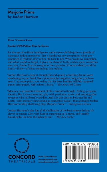 "It's the age of artificial intelligence, and 85-year-old Marjorie -- a jumble of disparate, fading memories, has a handsome new companion who's programmed to feed the story of her life back to her. What would we remember, and what would we forget, if given the chance? In this richly spare, wondrous new play, Jordan Harrison explores the mysteries of human identity and the limits, ifany of what technology can replace"--Back cove