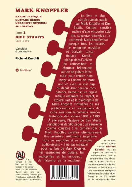 Le livre le plus complet jamais publié sur Mark Knopfler et Dire Straits, écrit par un auteur renommé, sans recours à l'intelligence artificielle. Conteur sensible, maître d'une virtuosité subtile, superstar détendue - la carrière de Mark Knopfler bat presque tous les records. Le musicien et écrivain suisse Richard Koechli plonge dans l'univers du compositeur et chanteur britannique au son de guitare inimitable pour rendre hommage à l'oeuvre de toute une vie avec un sens aigu du détail. Avec passion, compétence, humour et un regard critique empreint de respect, il explore l'art et la philosophie de Mark Knopfler, l'influence de ses prédécesseurs et compagnons de route, ainsi que le contexte musico-historique des années 1960 à 1990. À elle seule, l'histoire de Dire Straits remplit plus de 500 pages (un deuxième volume, consacré à la carrière solo de Mark Knopfler, paraîtra ultérieurement). Une aventure multimédia inspirante, riche en anecdotes et en exemples audio-visuels - à ne pas manquer pour les fans de Mark Knopfler, les passionnés de guitare, les audiophiles et les amoureux de l'histoire de la musique. (Traduction française de l'édition originale allemande)