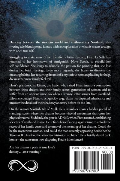 Dancing between the modern world and sixth-century Scotland, this riveting tale blends portal fantasy with an exploration of what it means to align with one's true self. Struggling to make sense of her life after a bitter divorce, Fleur La Salle has returned to her hometown of Antigonish, Nova Scotia, to rebuild her self-confidence. She longs to rekindle the passion for painting that she lost during her brief marriage. Even more urgently, she hopes to discover the meaning behind her recurring dreams of a mysterious woman pleading for help, dreams that increasingly feel real. Fleur's grandmother Eileen, the healer who raised Fleur, intuits a connection between these dreams and their family secret: generations of women said to suffer from an ancient curse. So when a strange letter arrives from Scotland, Eileen encourages Fleur to act quickly, to go claim her disputed inheritance and uncover the details of their shadowy ancestry before it's too late. On the remote Scottish Isle of Mull, Fleur stumbles upon a hidden portal of standing stones where her dreams become visceral encounters that cause her physical trauma. Suddenly, the year is AD 560, when Picts roamed, establishing societies of myth and magic. Fleur finds herself racing against time to unlock the secret of her family curse and to unravel the meaning of her dreams. Could she be the mysterious woman, and could the man recently appearing beside her be Thomas B. Hayden, the attractive historical architect Fleur briefly dated back home-the same man now disputing Fleur's inheritance? Are her dreams a peek at true love's destiny . . . or a warning?