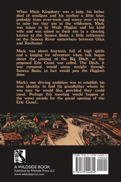 When Mark Kingsbury was a baby, his father died of smallpox and his mother a little later, probably from over-work and worry over trying to raise her tiny son in the wilderness. Mark was taken in by Wash Higgins and his kind wife and was raised as their son in a clearing known as the Seneca Basin, a little settlement on the Seneca River somewhere between Utica and Rochester. Mark was about fourteen, full of high spirits and a longing for adventure when talk began about the coming of the Big Ditch, as the proposed Erie Canal was called. The Ditch, it was rumored, would come straight through Seneca Basin, in fact would pass the Higgins's door. Mark's one driving ambition was to establish his true identity, to find his grandfather whom he was sure he would like, provided they could meet. Perhaps this meeting would happen at the water parade for the grand opening of the Erie Canal...