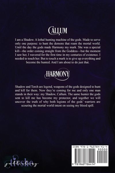 Callum I am a Shadow. A lethal hunting machine of the gods. Made to serve only one purpose: to hunt the demons that roam the mortal world. Until the day the gods made Harmony my mark. She was a special kill-the order coming straight from the Goddess. But the moment I saw her, I wavered for the first time in my centuries of existence because I needed to touch her. But to touch a mark is to give up everything and become the hunted. And I'm about to do just that. Harmony Shadow and Torch are legend, weapons of the gods designed to hunt and kill for them. Now they're coming for me and only one man stands in their way: my Shadow, Callum. The same hunter the gods sent to kill me has become my protector, and together we will uncover the truth of why both legions of the gods' warriors are scouring the mortal world intent on seeing my blood spill. Mark of the Shadow is a spicy dark paranormal fantasy. TWs can be found in the front of the book and on my website.