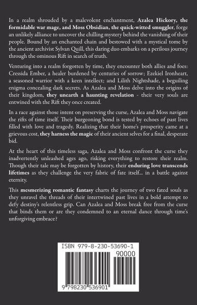 Mark of the Vanished: A Magical Odyssey Through Time and Fate In a realm shrouded by a malevolent enchantment, Azalea Hickory, the formidable war mage, and Moss Obsidian, the quick-witted smuggler, forge an unlikely alliance to uncover the chilling mystery behind the vanishing of their people. Bound by an enchanted chain and bestowed with a mystical tome by the ancient archivist Sylvan Quill, this daring duo embarks on a perilous journey through the ominous Rift in search of truth. Venturing into a realm forgotten by time, they encounter both allies and foes: Cressida Ember, a healer burdened by centuries of sorrow; Ezekiel Ironheart, a seasoned warrior with a keen intellect; and Lilith Nightshade, a beguiling enigma concealing dark secrets. As Azalea and Moss delve into the origins of their kingdom, they unearth a haunting revelation - their very souls are entwined with the Rift they once created. In a race against those intent on preserving the curse, Azalea and Moss navigate the rifts of time itself. Their burgeoning bond is tested by echoes of past lives filled with love and tragedy. Realizing that their home's prosperity came at a grievous cost, they harness the magic of their ancient selves for a final, desperate bid. At the heart of this timeless saga, Azalea and Moss confront the curse they inadvertently unleashed ages ago, risking everything to restore their realm. Though their tale may be forgotten by history, their enduring love transcends lifetimes as they challenge the very fabric of fate itself... in a battle against eternity. This mesmerizing romantic fantasy charts the journey of two fated souls as they unravel the threads of their intertwined past lives in a bold attempt to defy destiny's relentless grip. Can Azalea and Moss break free from the curse that binds them or are they condemned to an eternal dance through time's unforgiving embrace?