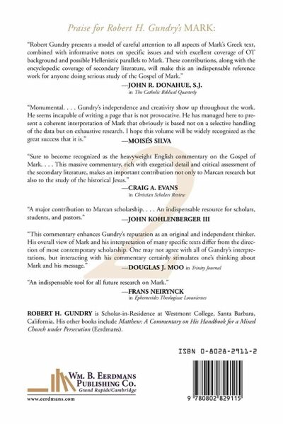 This is a print on demand book and is therefore non- returnable. The fullest commentary ever to come out on the Gospel of Mark, this monumental work by Robert H. Gundry, reflecting years of painstaking scholarship, presents a well-argued alternative reading of the Greek text of Mark. Gundry turns from form and redaction criticism, both of which he considers largely inapplicable to Mark, to a very close reading of Mark's text as it stands — a reading that pays special attention to such literary devices as word order, chiasm, inclusion, asyndeton, and the historical present tense. Driving the commentary is Gundry's provocative thesis that the Gospel of Mark constitutes a straightforward apology for the apparently shameful manner of Jesus' death; as such Mark is essentially an evangelistic tract rather than an obliquely written handbook of Christian discipleship and church life. Besides positing this bold, seldom-defended thesis, Gundry's commentary contains these features: Thoroughness of treatment, including extensive interaction with other interpretations and detailed discussions of authorship, date, etc.; A defense of the Papian tradition, including Mark as getting his materials from Peter; A rejection of the view that Mark 13 reflects the Jewish war of 66-70 C. E. A lengthy excursus on the Secret Gospel of Mark; A rejection of currently popular ironic, polemic, and other symbolic interpretations; New literary critical arguments supporting the view that Mark did not originally end at 16:8; and A massive bibliography.