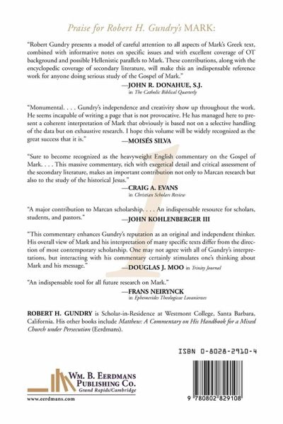 This is a print on demand book and is therefore non- returnable. The fullest commentary ever to come out on the Gospel of Mark, this monumental work by Robert H. Gundry, reflecting years of painstaking scholarship, presents a well-argued alternative reading of the Greek text of Mark. Gundry turns from form and redaction criticism, both of which he considers largely inapplicable to Mark, to a very close reading of Mark's text as it stands — a reading that pays special attention to such literary devices as word order, chiasm, inclusion, asyndeton, and the historical present tense. Driving the commentary is Gundry's provocative thesis that the Gospel of Mark constitutes a straightforward apology for the apparently shameful manner of Jesus' death; as such Mark is essentially an evangelistic tract rather than an obliquely written handbook of Christian discipleship and church life. Besides positing this bold, seldom-defended thesis, Gundry's commentary contains these features: Thoroughness of treatment, including extensive interaction with other interpretations and detailed discussions of authorship, date, etc.; A defense of the Papian tradition, including Mark as getting his materials from Peter; A rejection of the view that Mark 13 reflects the Jewish war of 66-70 C. E. A lengthy excursus on the Secret Gospel of Mark; A rejection of currently popular ironic, polemic, and other symbolic interpretations; New literary critical arguments supporting the view that Mark did not originally end at 16:8; and A massive bibliography.