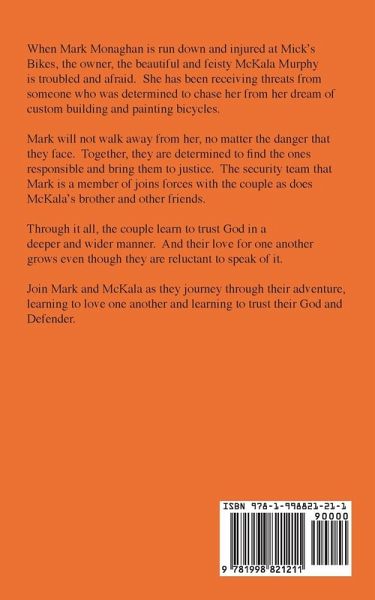 When Mark Monaghan is run down and injured at Mick's Bikes, the owner, the beautiful and feisty McKala Murphy is troubled and afraid. She has been receiving threats from someone who was determined to chase her from her dream of custom building and painting bicycles. Mark will not walk away from her, no matter the danger that they face. Together, they are determined to find the ones responsible and bring them to justice. The security team that Mark is a member of joins forces with the couple as does McKala's brother and other friends. Through it all, the couple learn to trust God in a deeper and wider manner. And their love for one another grows even though they are reluctant to speak of it. Join Mark and McKala as they journey through their adventure, learning to love one another and learning to trust their God and Defender.