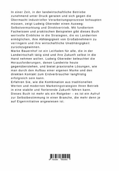 In einer Zeit, in der landwirtschaftliche Betriebe zunehmend unter Druck geraten und sich gegen die Übermacht industrieller Verarbeitungsprozesse behaupten müssen, zeigt Ludwig Obereder einen Ausweg: Selbstvermarktung und Direktvertrieb. Mit fundiertem Fachwissen und praktischen Beispielen gibt dieses Buch wertvolle Einblicke in die Strategien, die es Landwirten ermöglichen, ihre Abhängigkeit von Großabnehmern zu verringern und ihre wirtschaftliche Unabhängigkeit zurückzugewinnen.Marke Bauernhof ist ein Leitfaden für alle, die in der Landwirtschaft tätig sind und ihre Zukunft selbst in die Hand nehmen wollen. Ludwig Obereder beleuchtet die Herausforderungen, denen Landwirte heute gegenüberstehen, und bietet praxisnahe Lösungen, wie man durch den Aufbau einer eigenen Marke und den direkten Kontakt zum Endverbraucher langfristig erfolgreich sein kann.Erfahren Sie, wie die Kombination aus traditionellen Werten und modernen Marketingstrategien Ihren Betrieb in eine stabile und florierende Zukunft führen kann. Dieses Buch ist mehr als ein Ratgeber - es ist ein Aufruf zur Selbstbestimmung in einer Branche, die mehr denn je auf Eigeninitiative angewiesen ist.