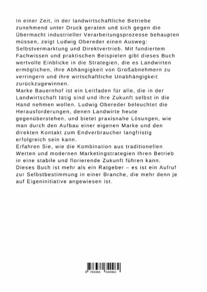 In einer Zeit, in der landwirtschaftliche Betriebe zunehmend unter Druck geraten und sich gegen die Übermacht industrieller Verarbeitungsprozesse behaupten müssen, zeigt Ludwig Obereder einen Ausweg: Selbstvermarktung und Direktvertrieb. Mit fundiertem Fachwissen und praktischen Beispielen gibt dieses Buch wertvolle Einblicke in die Strategien, die es Landwirten ermöglichen, ihre Abhängigkeit von Großabnehmern zu verringern und ihre wirtschaftliche Unabhängigkeit zurückzugewinnen.Marke Bauernhof ist ein Leitfaden für alle, die in der Landwirtschaft tätig sind und ihre Zukunft selbst in die Hand nehmen wollen. Ludwig Obereder beleuchtet die Herausforderungen, denen Landwirte heute gegenüberstehen, und bietet praxisnahe Lösungen, wie man durch den Aufbau einer eigenen Marke und den direkten Kontakt zum Endverbraucher langfristig erfolgreich sein kann.Erfahren Sie, wie die Kombination aus traditionellen Werten und modernen Marketingstrategien Ihren Betrieb in eine stabile und florierende Zukunft führen kann. Dieses Buch ist mehr als ein Ratgeber - es ist ein Aufruf zur Selbstbestimmung in einer Branche, die mehr denn je auf Eigeninitiative angewiesen ist.